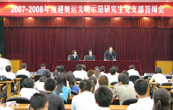6月12日下午,北航“迎奥运文明示范研究生党支部答辩会”在如心大报告厅举行。参加答辩的24个研究生党支部是从全校199个研究生党支部中经各院系推荐产生的。经过3个多小时的激烈角逐,综合各支部客观业绩和答辩情况,我院研究生SY07201党支部脱颖而出,同其他10个党支部共同被评为“迎奥运文明示范研究生党支部”暨“2007-2008年度校级先进研究生党支部”。