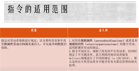 意大利罗马第一大学博士生越思雨的报告题目为“数字化服务平台对劳动法律规制带来的挑战和机遇”。基于数字化信息技术对雇佣关系的定性和调整带来挑战的背景,越博士集中对欧洲议会和理事会在2021年9月12日提出的《改善数字平台工作中劳动条件指令》及其在意大利的实施情况进行介绍,并以其为基础对劳动关系的附属性推定、劳动者权利的全面性展开讨论。指令将所有的平台工作者都纳入了规制对象,但在规制对象范围之内又进行了二元化的区分:借助平台展开工作的人和平台劳动者,即所谓的附属性劳动者和自主性劳动者。最后,她参照欧盟和意大利相关法律规定,对我国劳动法律规制提出了认定平台劳动的性质、劳动法规制附属性平台劳动关系、民法典规制自主性平台劳动关系三点建议。