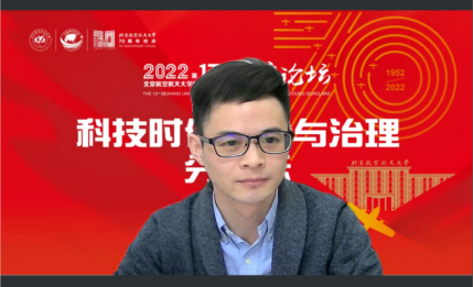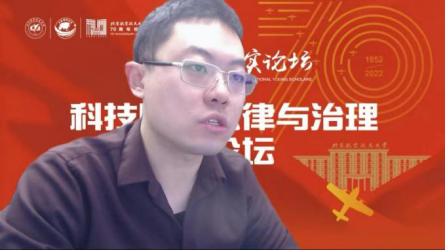 论坛第二单元的主题为“公法视阈下的科技时代法律与治理”,由北京航空航天大学法学院院长助理李游助理教授主持。李游老师结合个人经历谈论了在英国上市公司365的收获:“幸福感”与“获得感”。接着,提到了我国偏重公法治理的规制特点,在科技融合的时代里存在困境,需要以更开阔的视野来探讨私法治理。
