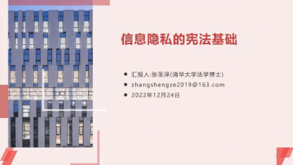 清华大学法学院博士生张圣泽以《信息隐私的宪法基础》主题进行了汇报。她首先分析了从隐私到信息隐私的一个发展溯源,在隐私成为宪法权力的过程中,存在“半影”“不被打扰的独处权”等众多理论,也引起了支持隐私和反对隐私的讨论。隐私已然成为宪法权利,但各国的路径存在差别,中国主要是采用未列举的基本权利角度探讨。而信息隐私主要是作为参照物与决策型隐私相区分。之后,张博士提出了信息隐私保护的现状及问题,不同于美德的扩张性保护,我国采取限缩隐私概念的路径,在隐私之外另行创设个人信息权。对于信息隐私,美国确立了两级检验的方式,但我国司法实践判断标准比较混乱,张博士以微信读书案为例展现了从“合理隐私期待”到“私密性”裁量。最后,她从宪法是否保护信息隐私与如何保护信息隐私两个方面展开隐私保护的宪法因应。通过梳理域外判例,归纳了反对说、支持说、搁置讨论三种态度。目前我国学界对信息隐私的宪法架构主要是层级划分,但张博士认为,从侵权方式而言采用过程覆盖的方式更为合适。