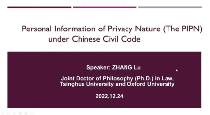 清华大学法学博士张璐老师的报告题目为“Personal Information of Privacy Nature under Chinese Civil Code”。张博士认为,中国《民法典》通过第1034条“私密信息”的提出,构建了隐私权和个人信息权益保护的区分路径,这种模式是不同于美国和欧盟的“第三条道路”。虽然这种区分具有重要的意义,但是也带来了潜在的问题。接着,她对个人私密信息的背景、识别、典型的个人私密信息测试进行了介绍。在个人私密信息的界定上,张博士认为,个人私密信息是隐私的一个部分,可以采取“法律列举辅之综合考量”的方式作出定义。在个人信息的私密性检验中,应综合个人信息处理的情境和目的采用主客观相结合的方法,将私人性、可获得性、可识别性、风险性归为重要影响因素。同时,她认为,身份证号码、生物识别信息、财务信息是个人私密信息的典型类型。