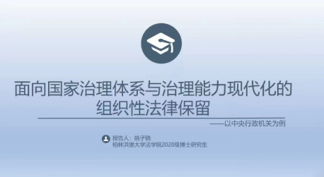 德国柏林洪堡大学法学院博士生姚子骁做了《面向国家治理体系和治理能力现代化的组织性法律保留——以中央行政机关为例》的主题报告,关注组织性法律保留在国家组织法中的应用。他认为,科技时代对人类文明的冲击,使得法律难以在实质上提出明确可适用的标准,未来合法性与正当性可能都会更加依赖组织与程序。法律保留的判断标准发源于德国,通常有全面保留说和重要性理论,不能直接适用于我国。结合我国宪法规定的权力制约与监督原则,姚博士排除了全面保留说,选择了更契合我国宪法基础的重要性理论。接着,他谈到该理论在组织法的中的具体化,需要结合我国宪法的依法治国原则与人民民主原则,将职权这一组织法的核心概念作为基础,进而将重要性理论转化为组织事项与职权的关系:即越重要的职权,法律保留的规制密度越高;与职权的关系越紧密的组织事项就越重要,法律保留的规制密度就越高。然后,他从机构和组织两个角度,将我国中央行政机关的组织性事项类型化,建构起我国中央行政机关的组织性法律保留制度。