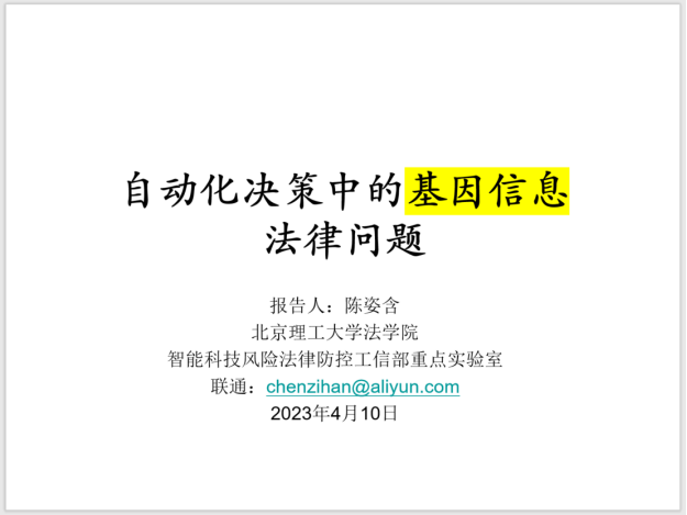 陈姿含老师以自动化决策中的基因信息法律问题为切入,围绕该问题展开了三方面探讨。一是介绍了目前作为规制算法基础的三类算法来源。二是在信息流通部分,探讨了在数量庞大的群体敏感信息累加过程中,根据相关性而生成新的个人数据后,数据主体行为与结果之间因果关系的有无、发生群体性关联的个人信息风险以及数据库编辑带来的个人隐私泄露风险等。陈老师指出,该问题的关键在于算法规则与信息规则的价值选择,不同国家在此问题上存在不同观点。三是在信息分类规则下,基于是否在公共领域流通以及是否为个人信息,提出了四种类别的具体情形。随后,陈老师基于基因信息的特殊性,提出健康医疗信息兼具个体价值与群体价值,基因信息包含科技、人权与信息三重维度,并创新性地提出了基因信息的识别性、稳定性、预测性、社群关联性、人类整体性等特征。为具体阐释,陈老师通过丰富的案例和跨学科知识向大家介绍了人体基因科技。在以人体作为对象的科技运用上,陈老师提出业界现存的争议,并从法律视角切入,重点分析人体基因科技的风险认定与思辨。最后,在人体基因科技运用的法理视角上,基因科技的运用争议根本上反应了决定论与非决定论的对立统一,前者包括基因决定,环境决定以及共同决定三点,后者则强调人类自由意志的决定性作用。