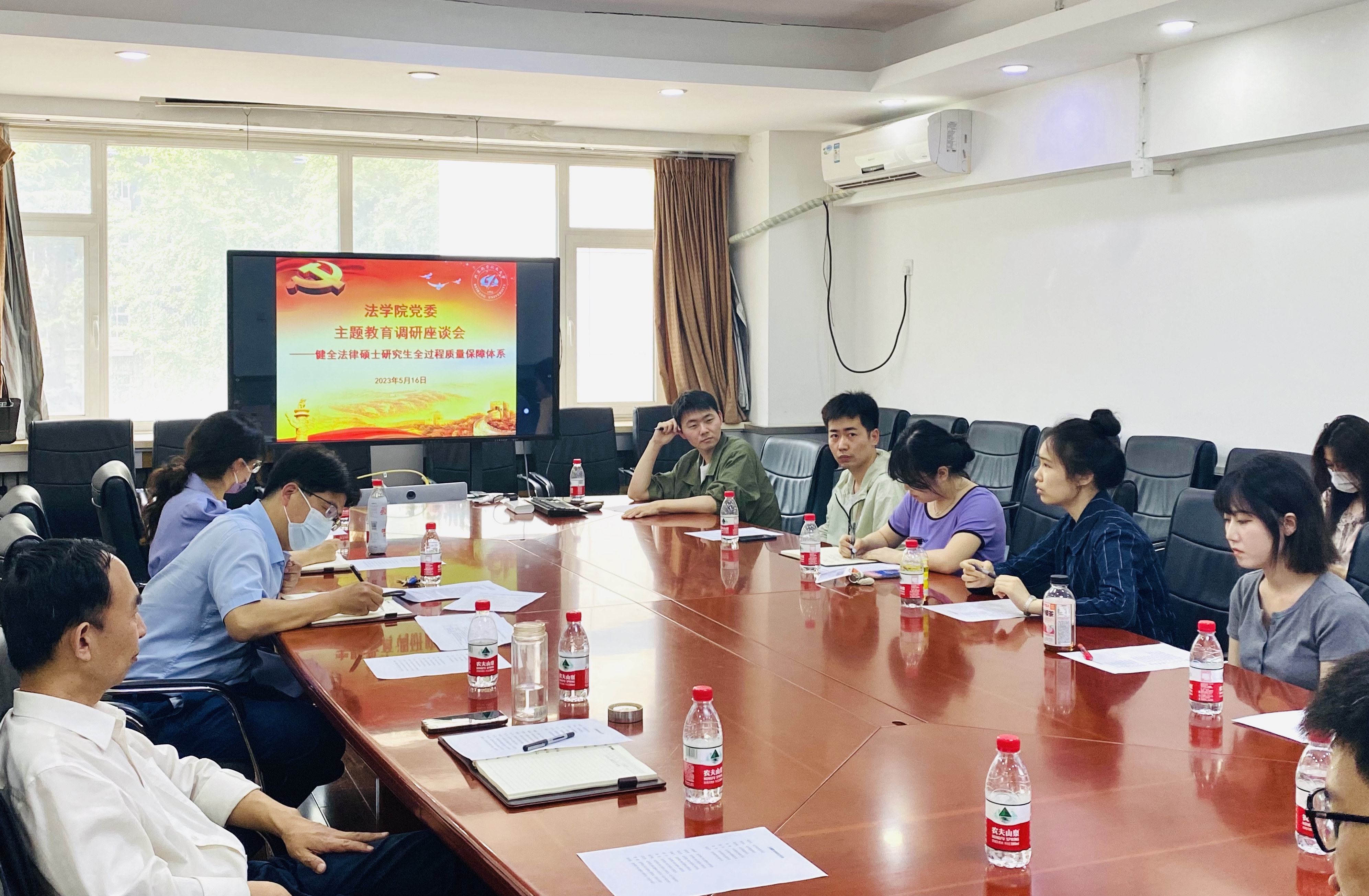 为全面贯彻、落实党的二十大精神,扎实抓好主题教育,学思践悟,以知促行,5月16日下午,法学院举办“健全法律硕士研究生全过程质量保障体系”主题教育专题调研座谈会。本次专题调研立足新文科建设工作和法律硕士人才培养工作质效,法学院党委书记周友军、副院长泮伟江、副院长周学峰、党委副书记张渊、专职组织员、专兼职辅导员及2022级法律硕士研究生代表参与座谈。