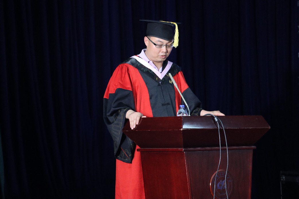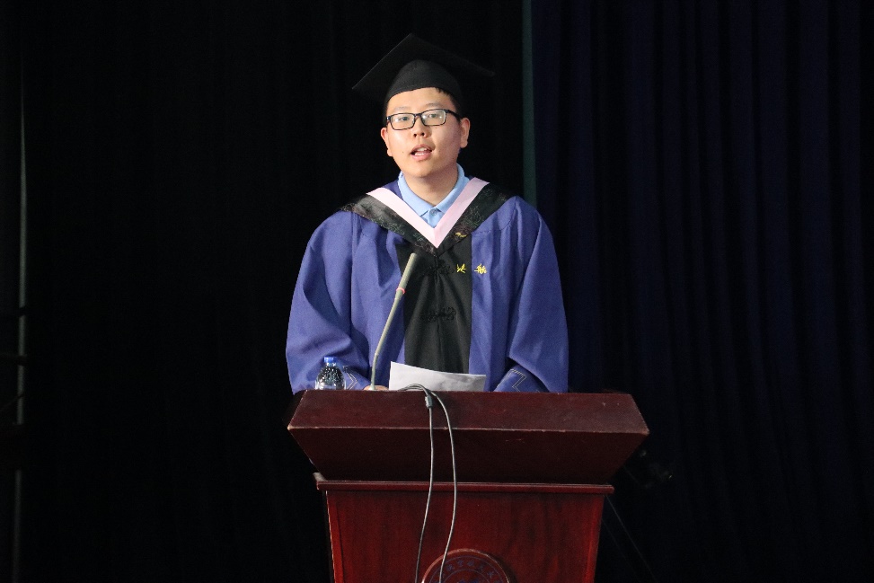 毕业生代表李炳毅同学代表全体毕业生向学院的领导、老师、辅导员表达感恩之情。他回顾自己在法学院求学的三年时光,脚踏实地,收获到专业的法律知识和严谨的法律思维;携手并肩,与可亲可敬的老师和志同道合的朋友共同成长;永葆初心,将会继续怀着法治天下的初心理想和坦然豁达的人生态度奔赴人生的新航段。