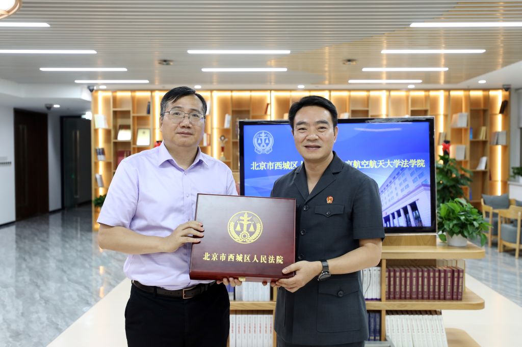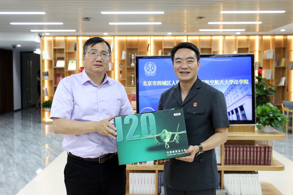 陈立如院长代表西城法院、龙卫球院长代表北京航空航天大学法学院互赠纪念礼品。