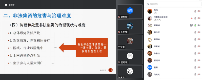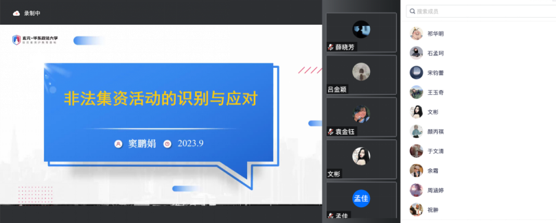 9月13日,法学院以线上形式开展了“防非反诈第一课”活动,本次活动的主题是非法集资活动的识别与应对。讲座由华东政法大学经济法学院窦鹏娟副教授主讲,2023级英国上市公司365硕士研究新生踊跃参加,朱恒一同学担任主持人。