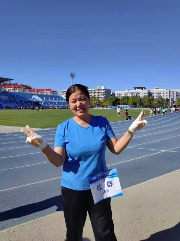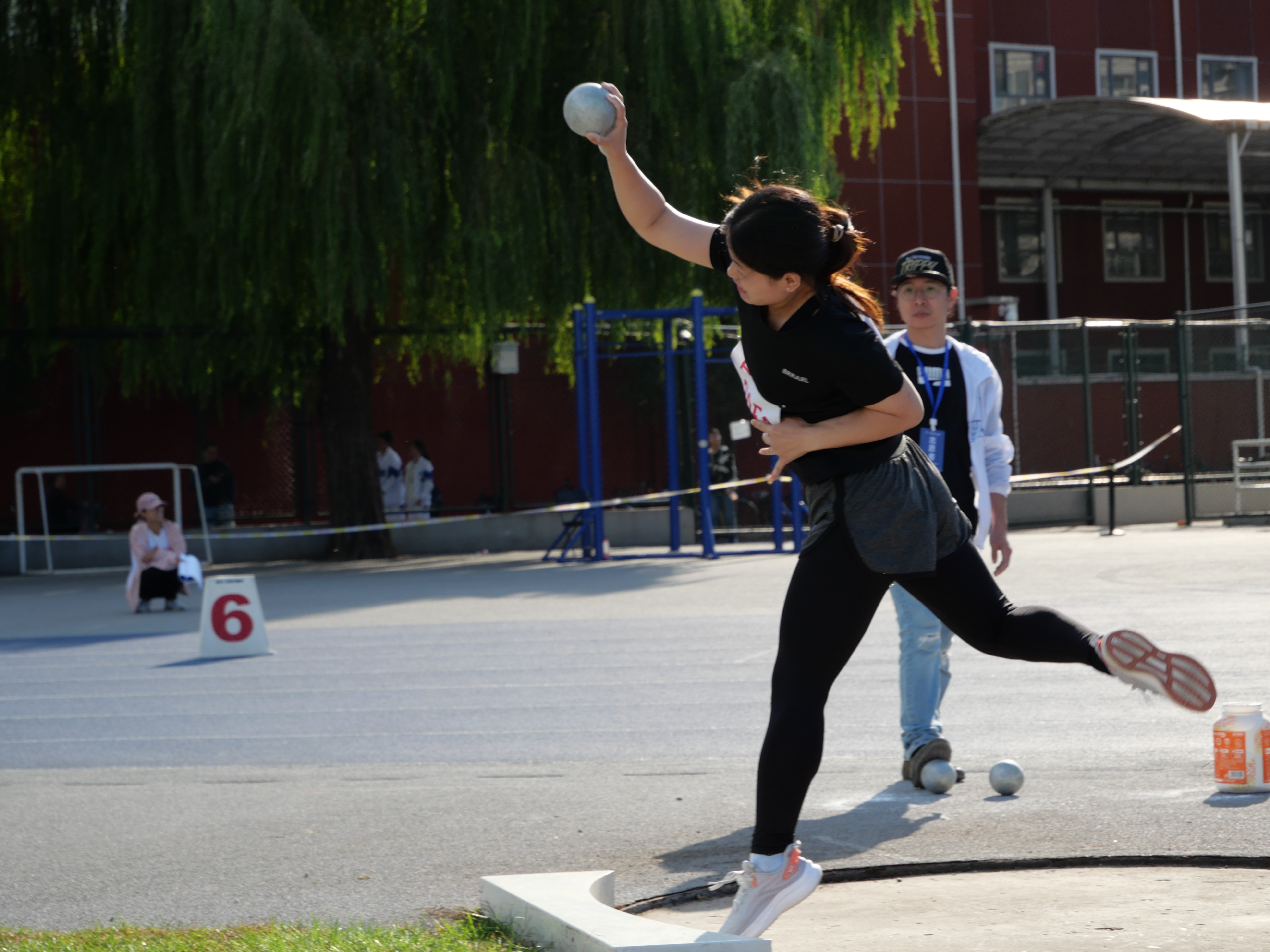 杜群老师挥舞着充满力量的双臂,将实心球化成美丽的弧线,获得教师乙组第四名的好成绩!
