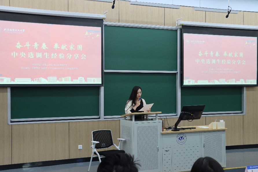 为响应党和国家赴基层工作的号召,加强选调生队伍建设,激励北航学子扎根基层,建功立业,10月21日,“奋斗青春·奉献家国”校友对话之选调生经验分享会在主楼121举行。本次宣讲会由学生工作部、就业指导服务中心主办,法学院、宇航学院、人文公管学院承办。在校庆71周年即将到来之际,有幸邀请到优秀选调生校友姜南、郑琦、张皓天进行精彩分享。分享会吸引二百余名本研学生共同参加。