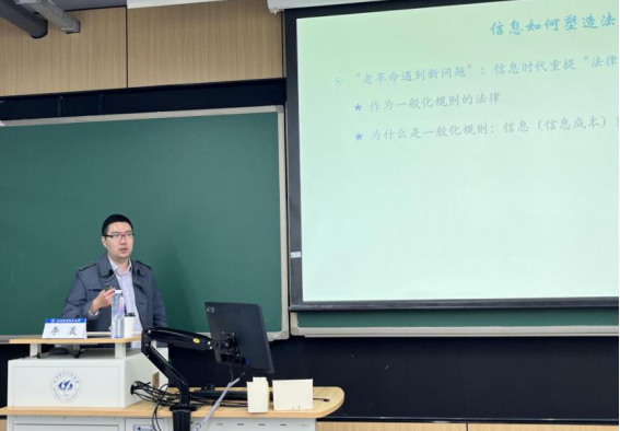 随后,李晟老师以“人工智能时代法律向何处去”为引入,提出新时代背景下“法律是什么”的老问题,并指出法律规则的形态是由信息或信息成本所塑造。李晟老师从信息具有定位事件、指引行为的功能切入,向同学们介绍了在有限条件下获取的有限信息如何影响了决策,并通过信息对于小型社群和大型社群的不同意义,展现了在社会的变迁中,抽象性作为人类心智的构成特征,对世界进行分类,从而在有限信息约束下实现规则的一般化,完成塑造法律的过程。