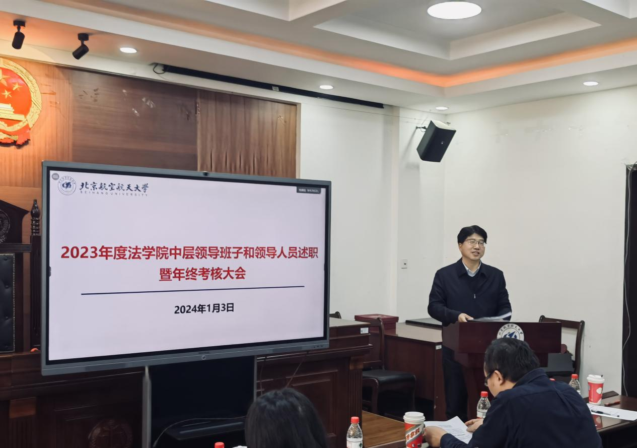 1月3日,法学院在八号楼101召开2023年度中层领导班子和领导人员述职暨年终考核大会,学院领导班子、全院教职工50余人参加。会议由副院长泮伟江主持。