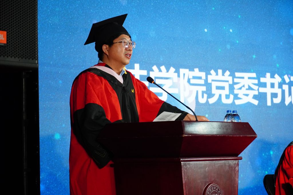 在热烈的掌声中,法学院党委书记周友军致辞。他向2024届毕业生致以热烈的祝贺和美好的祝愿,同时也向法学院所有参与人才培养的教职员工表示衷心的感谢和崇高的敬意。周友军书记肯定了同学们在各个领域的突出表现,在为大家感到高兴和自豪的同时,也对同学们提出殷切期望。他向毕业生分享了自己在毕业时导师的赠言,用三个“不出问题”勉励毕业生,希望大家始终保持清醒的头脑,守住航法人的底线,在不断学习中适应社会环境的发展变化。他希望同学们传承航法精神,担负起新时代青年的使命责任,时刻审视、雕琢自己,用在北航汲取到的养分滋养自己前行的道路。他勉励同学们牢记“德才兼备、知行合一”的校训,将个人发展与国家需求紧密结合,服务家国,奉献社会,不负韶华,追求卓越。周友军书记表示,无论未来身处何方,航法永远是同学们温暖的家,祝愿2024届本研毕业生在新的起点上建功立业,一路繁花。