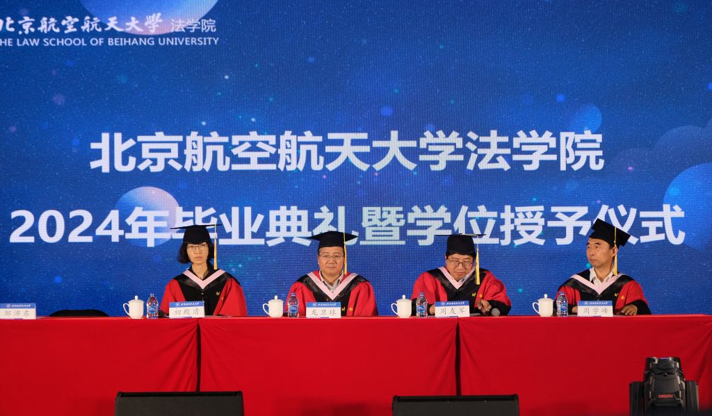 心怀炽热,奔赴山海。6月22日下午,北京航空航天大学法学院2024年学生毕业典礼暨学位授予仪式在学术交流厅隆重举行。法学院学位委员会主任龙卫球,党委书记周友军,副院长初殿清,副院长周学峰,党委副书记邹沛东,教师代表杜群、王永茜、刘盈皎,学生班主任、辅导员及2024届本研毕业生出席本次典礼。毕业典礼暨学位授予仪式由邹沛东主持。