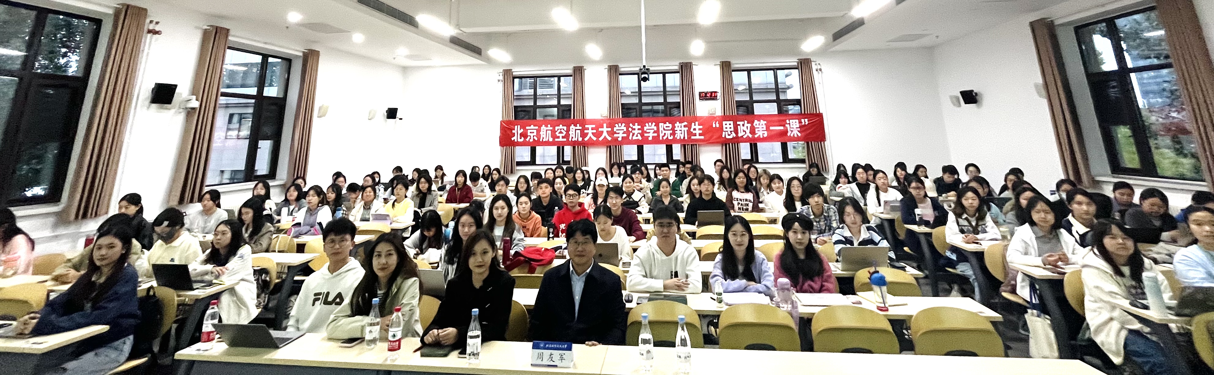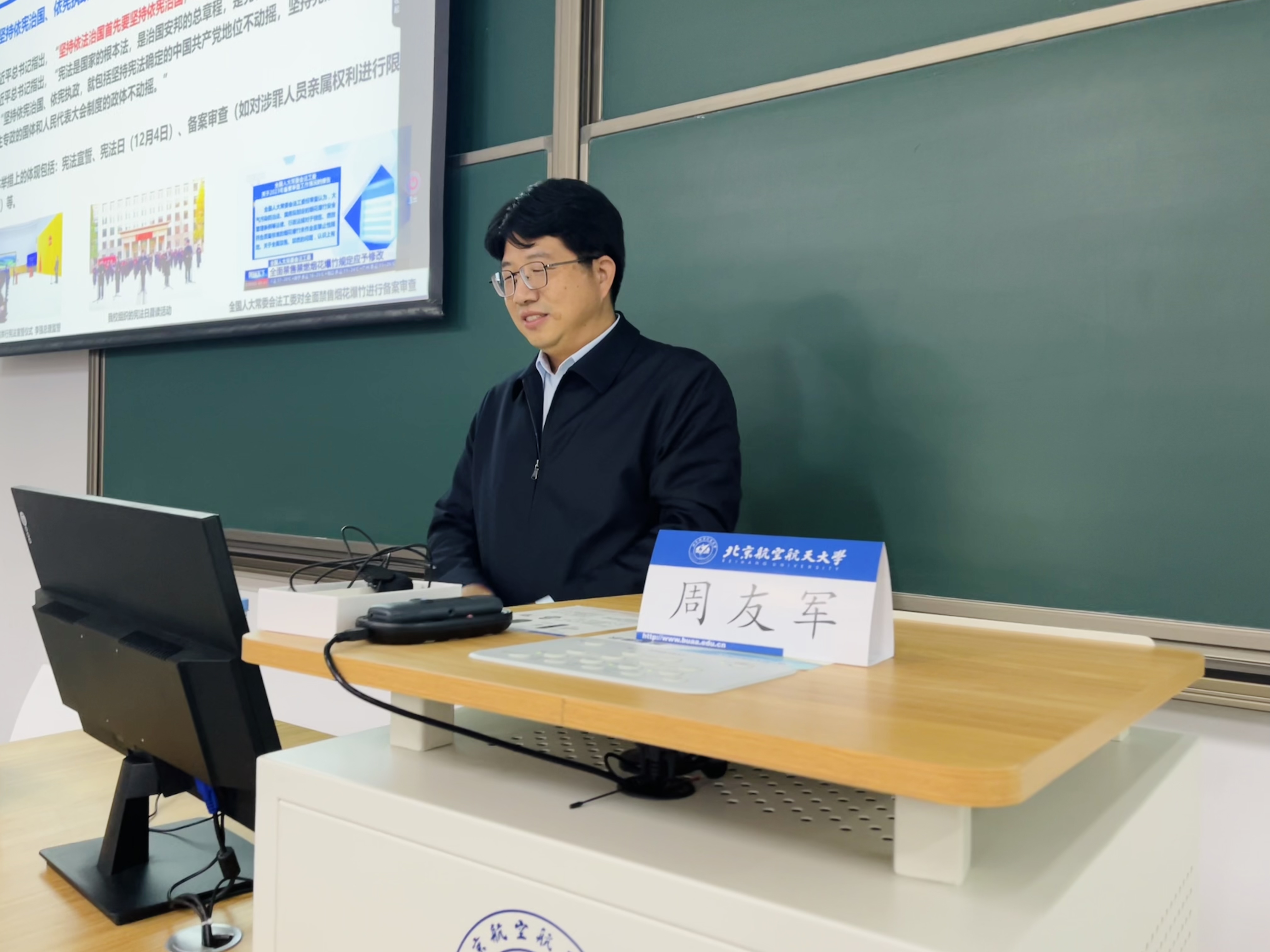 课程伊始,周友军代表法学院党委问候全体新生,对新同学的到来表示热烈欢迎。他希望大家提高政治站位,时刻保持向党看齐的意识,肩负起新时代新征程赋予的光荣使命。接下来,周友军从习近平法治思想的形成与发展讲起,论述了习近平法治思想的实践逻辑、理论逻辑和历史逻辑,阐述了习近平法治思想的核心要义、重大意义和鲜明特色。周友军强调,习近平法治思想是21世纪马克思主义法治思想,是全面依法治国的根本遵循和行动指南,标志着马克思主义法治思想的新飞跃。他希望法学院全体同学,加强理论学习,提升思想觉悟,深刻领悟和践行习近平法治思想。最后,周友军介绍学院人才培养特色,鼓励同学们在法学院学习期间要扎实理论知识、增强专业素养、积极投身实践,为法治中国建设贡献航法力量。