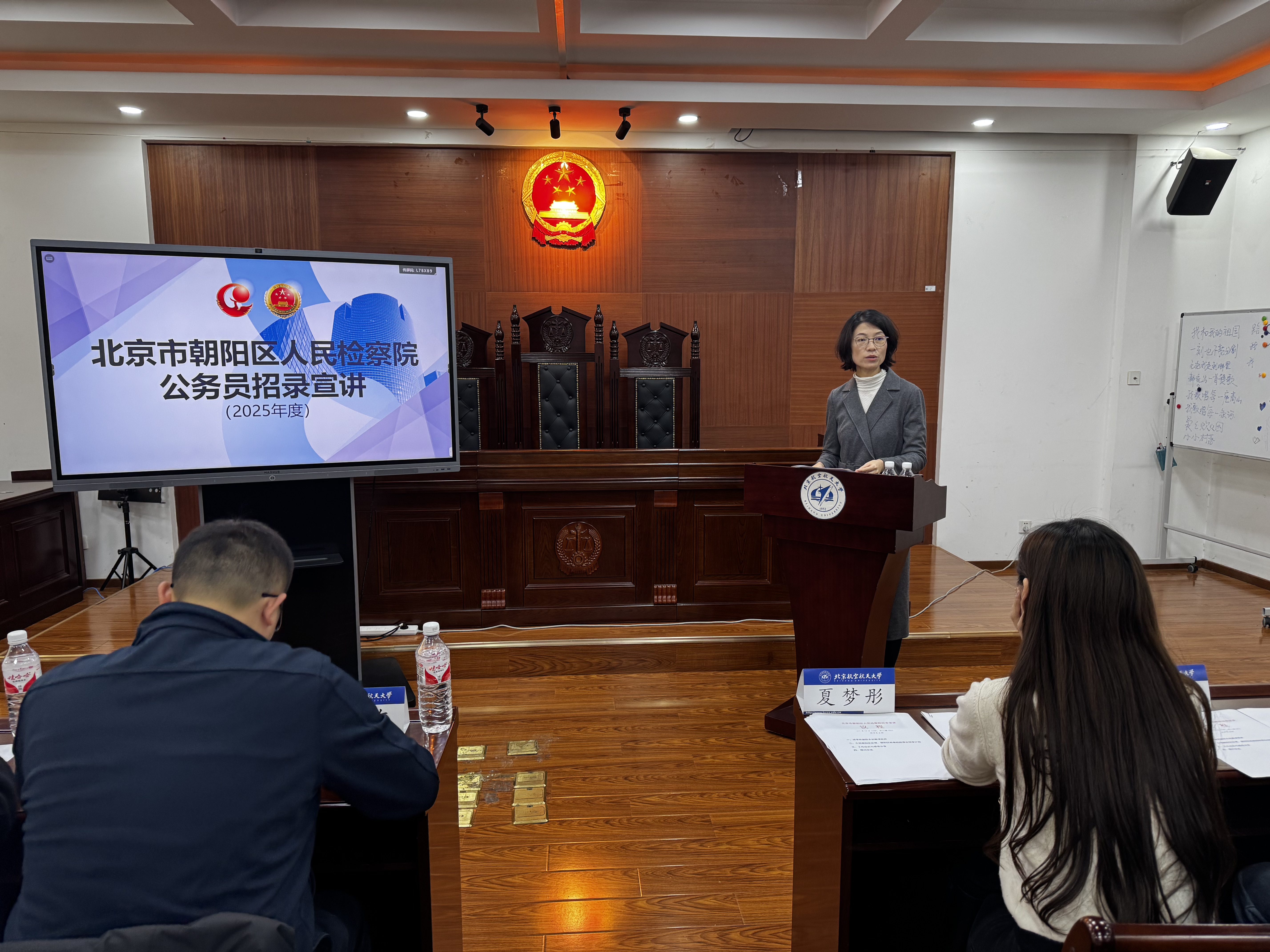 李泽组长向同学们系统介绍了朝阳区的基本情况、朝阳区人民检察院的发展历程、人员编制、机构设置、办公条件、工作平台和取得的相关集体荣誉成就,详细介绍了朝阳区人民检察院本年度的招录计划和招录条件。