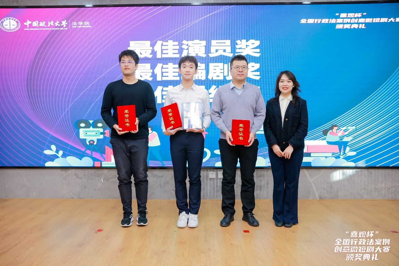 本次比赛设置一等奖一项、二等奖两项、三等奖三项,共收到了全国20余所院校50多份参赛作品。我院法律硕士班和本科生行政法案例与实践班的同学在毕洪海老师的组织下,积极投稿参赛,是本次比赛中投稿数量最多的院校,被主办方授予了最佳组织奖。最后我院2023 级法律硕士参赛团队作品《凭什么开除我!》在众多参赛作品中脱颖而出,获得了三等奖(团队成员:蔡佳玉、王佳诚、刘依冉、林思芃、文彬)。行政法微短剧比赛的项目是对参赛队伍成员理论、实践和表达等诸多能力的全方面检验,对于进一步宣传行政法在国家治理体系和治理能力现代化方面的作用起到了重要的作用。