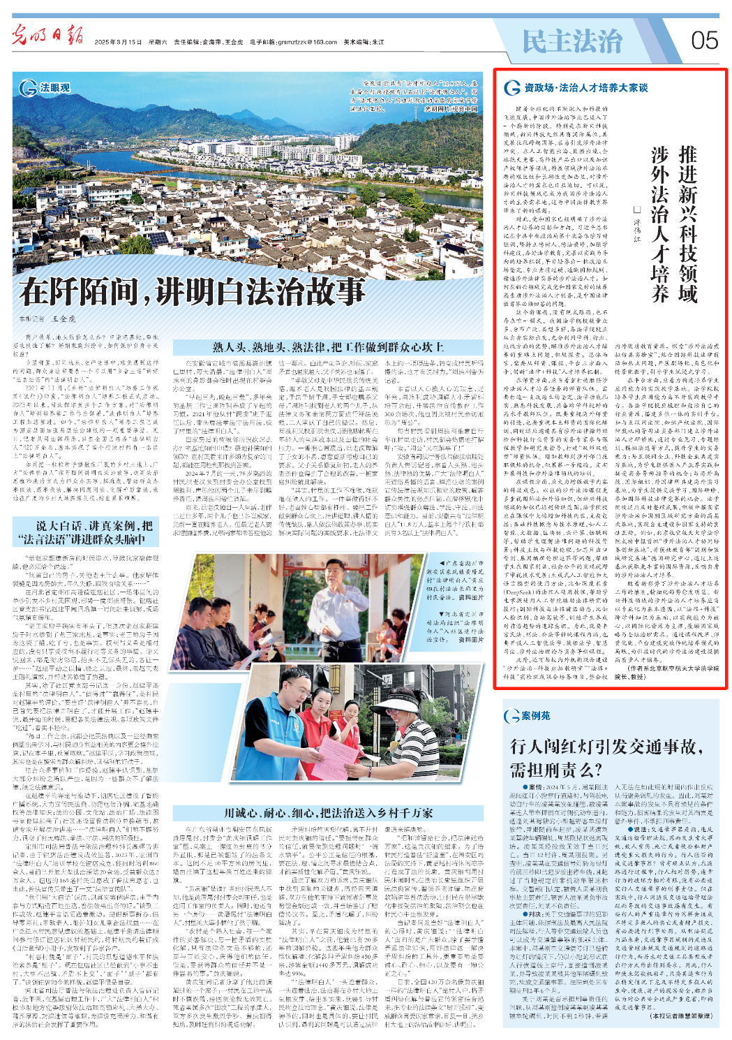 2025年3月15日,《光明日报》“资政场·法治人才培养大家谈”栏目刊发北京航空航天大学法学院院长泮伟江教授文章《推进新兴科技领域涉外法治人才培养》。文章深入剖析了新兴科技发展对我国涉外法治人才培养体系带来的多重挑战,系统论证了法学院校在师资队伍建设、课程体系优化、实践平台搭建等方面应当采取的举措,并着重指出了理工科强校所开设的新型法学院在这一领域所具备的独特优势。文章呼吁我国法学院校强化使命担当,凝聚共识,协同推进“科技+涉外”法治人才培养机制的改革创新,为服务国家战略需求、支撑新兴科技领域的涉外法治事业提供高质量人才保障。