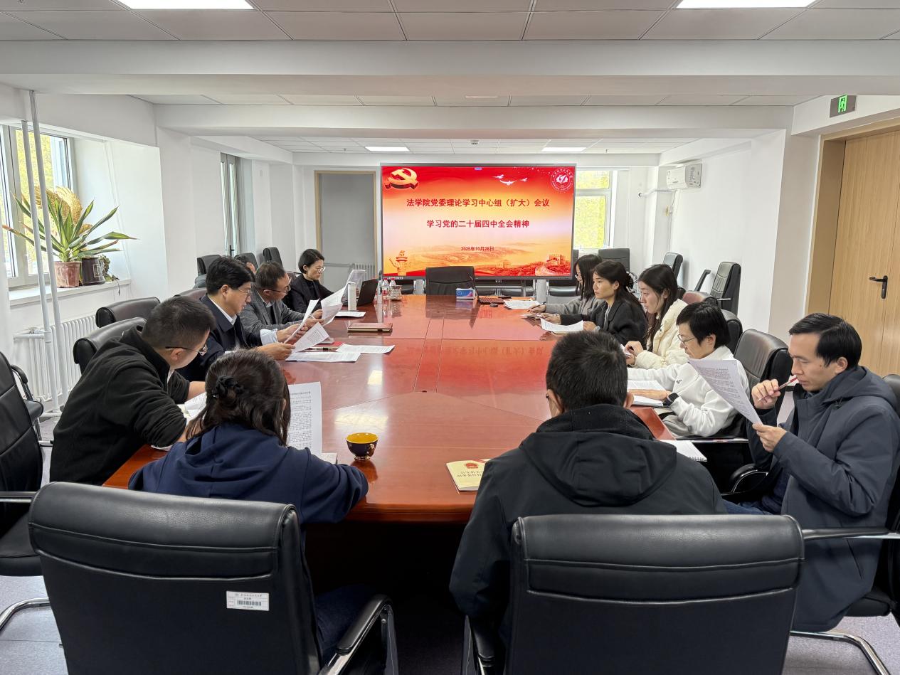 2025年10月28日中午,我院在学院路校区九号楼201会议室召开党委理论学习中心组(扩大)会议,专题学习党的二十届四中全会精神。法学院党委理论学习中心组成员、各党支部书记参会。党委书记周友军主持会议。