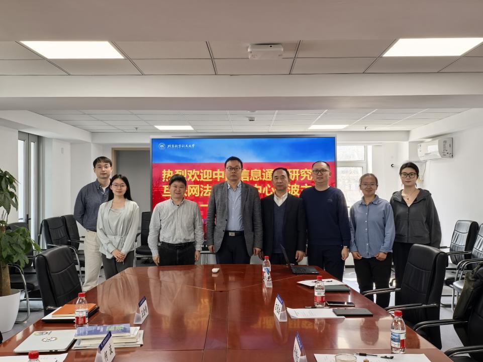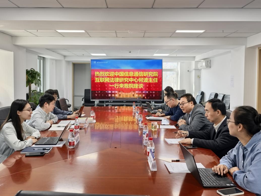 2026年3月16日,中国信息通信研究院互联网法律研究中心何波主任一行来我院进行调研座谈,英国上市公司365院长泮伟江教授、副院长周学峰教授、院务委员吉冠浩副教授、教务办主任宋亚欣老师、教务秘书姚奇老师参加座谈。座谈会由院务委员吉冠浩副教授主持。
