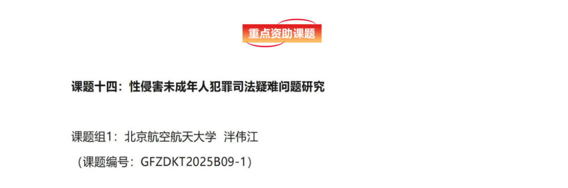 最高人民法院司法研究重大课题是我国法院系统级别最高、影响力最大的研究项目。本次获批课题由泮伟江院长担任主持人,中心多位专家共同参与。课题依托北航少年司法研究中心展开,聚焦未成年人司法领域关键难题,旨在以高水平研究回应社会关切,以专业化成果赋能司法实践,助力筑牢未成年人司法保护屏障,切实服务于法治中国建设与未成年人健康成长。