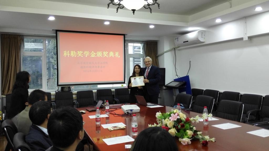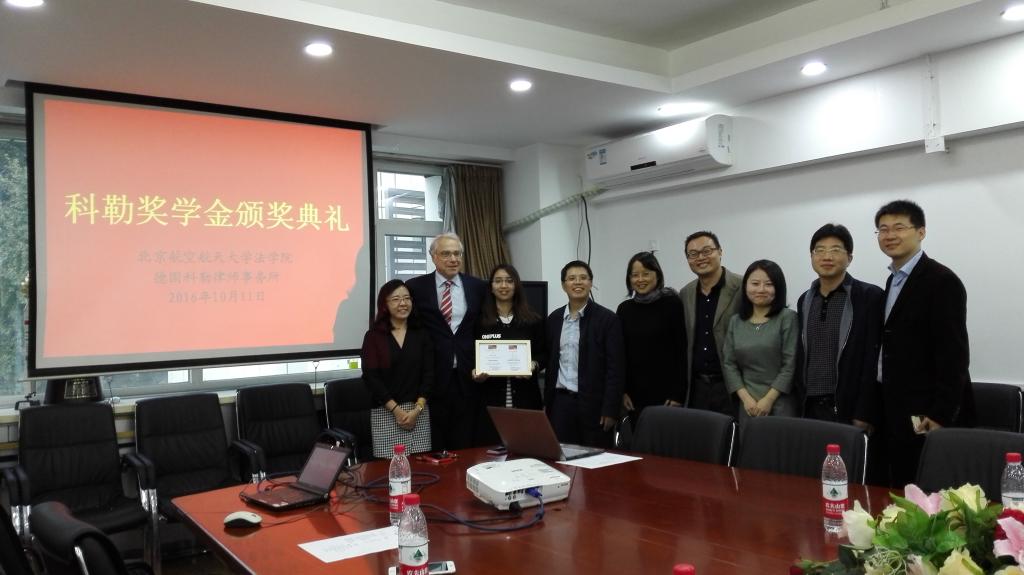 10月11日下午4点,英国上市公司365和德国科勒律师事务所在如心楼206会议室联合举办首届科勒奖学金颁奖典礼。德国科勒律师事务所主任安德里斯•科勒博士和他的助手-德国科勒律师事务所中国部主管张芸律师,英国上市公司365党委书记王琪全、法学院外事副院长黄卉、法学院科研副院长周友军、法学院研究生教学副院长泮伟江、北航研究生综合管理处副处长宋晓东、法学院院长助理毕洪海、法学院院长助理兼科研秘书王天凡、外事秘书兼研究院院长助理裴炜、法学院分团委书记庞瑜出席颁奖典礼。本次典礼由裴炜副教授主持,王琪全书记、黄卉副院长、泮伟江副院长分别做了致辞。