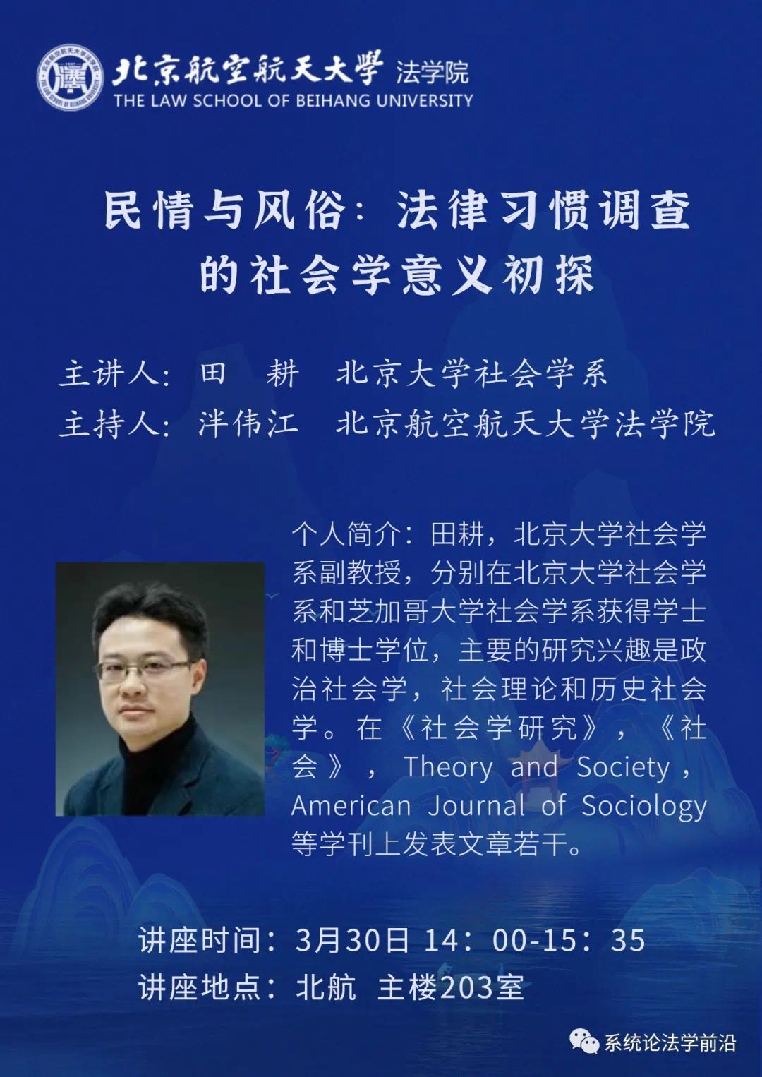 讲座预告- 田耕 | 民情与风俗:法律习惯调查的社会学意义初探