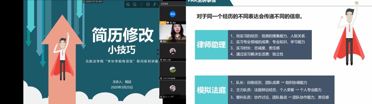 2017、2018级硕士研究生开展“学长学姐有话说”职问系列讲座之简历修改小技巧主题活动。活动将云端“防疫”与毕业班学生群体需求紧密结合,引导同学们在疫情防控期间正确认识形势现状,居家期间积极展开线上求职,拓展心理疏导通道,利用云端讲座不断提升自己的综合能力。根据学校疫情防控工作重点和同学们反馈的问题,辅导员再次强调了防疫期间原地不动和如实上报信息的原则,分析了境外疫情发展和防控情况,引导同学们正确认识国际形势,认识我国疫情防控工作的制度优势,坚定“四个自信”,提醒大家理性看待近期部分地区“解封”情况,居家期间仍需注意做好防护工作。同时,对于同学们关心的就业和答辩问题,积极拓宽就业信息获取渠道,提供了线上PPT制作技巧网站。最后为大家展示了北航积极心理体验中心为大家提供在线心理咨询和心理援助通道,助力科学防控,期待安全返校。