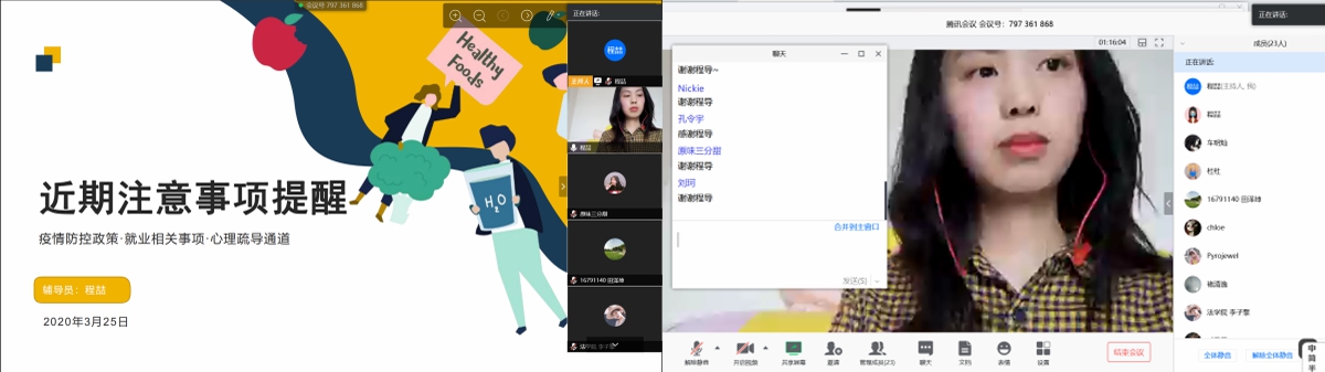 2016级本科生162012小班在辅导员的主持下,解读当前疫情防控政策,辨析国际形势。明确了要正确看待疫情防控工作,积极配合如实上报,原地不动等待开学,需要时找到合适的心理疏导通道。作为毕业班,还参加了研究生毕业班组织的求职简历修改指导活动。