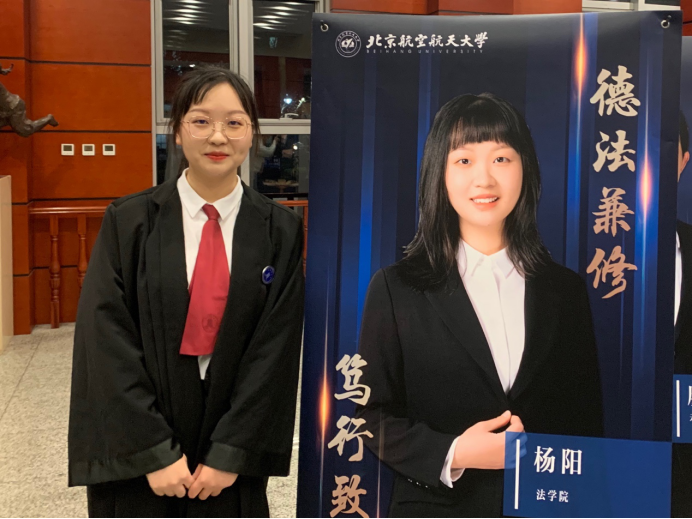 杨阳,女,汉族,中共党员,北京航空航天大学法学院2018级本科生,1820团支部团支书,曾任法学院学生会主席。学习成绩优异,本科三年总成绩年级排名第一,多次获得国家奖学金等奖励,保研获得中国人民大学法学院拟录取资格。积极参与学科竞赛,带领北航代表队斩获北京市大学生模拟法庭竞赛三等奖和全国大学生模拟法庭竞赛一等奖,个人两获全国赛“最佳选手奖”。乐于钻研,担任法学院智库本科生科研助理,深入参与多项国家级、省部级项目。社会实践广泛,曾赴湖南省十八洞村开展实践,获社会实践优秀奖学金一等奖。