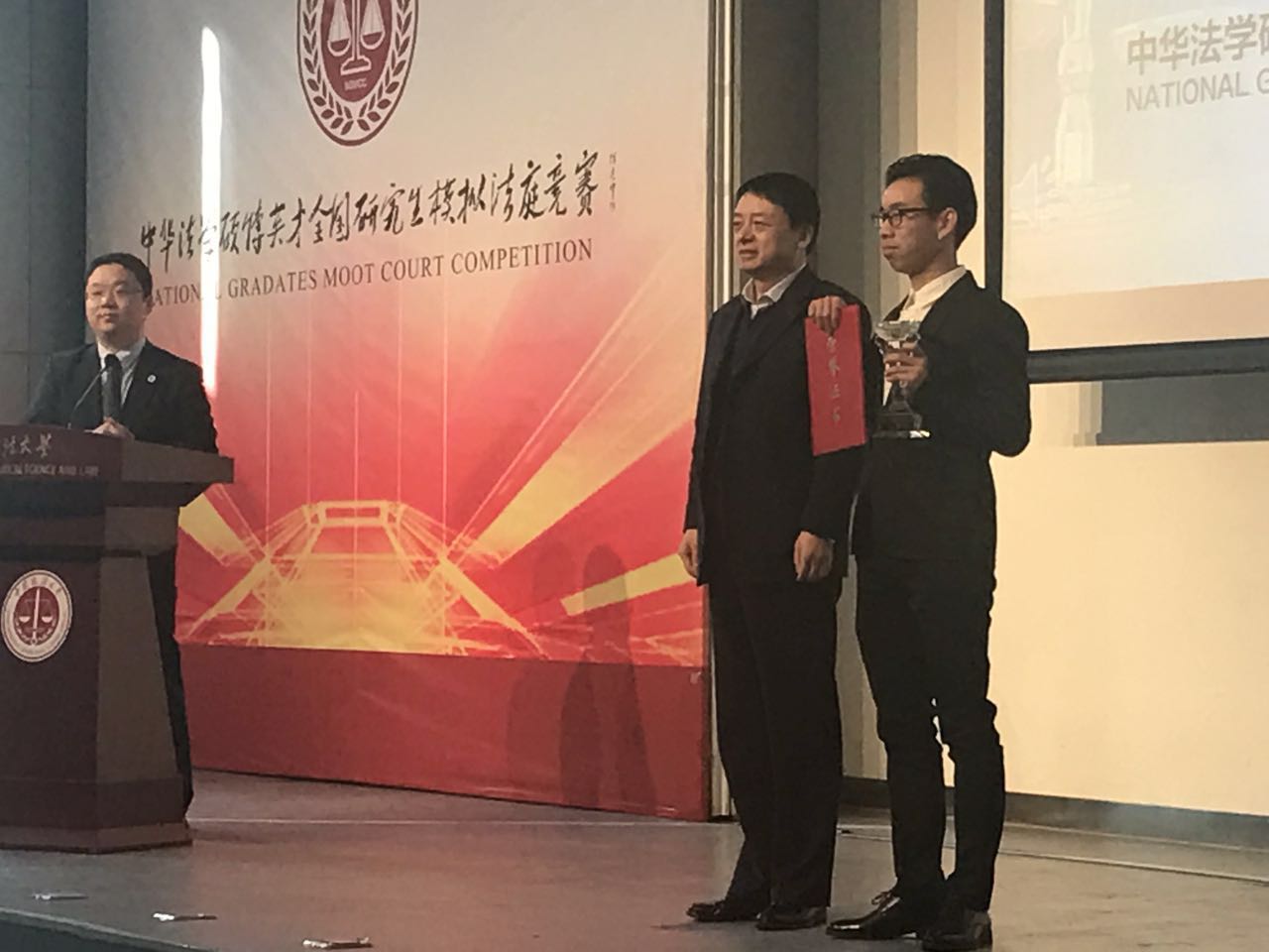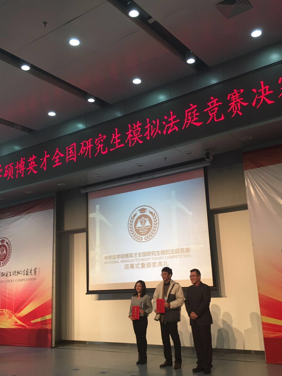 中国政法大学马怀德副校长向我院代表队颁发了冠军奖杯和证书,中国政法大学刑事司法学院王顺安教授为我院裴炜副教授和华东政法大学孙建民教授颁发优秀指导教师奖。