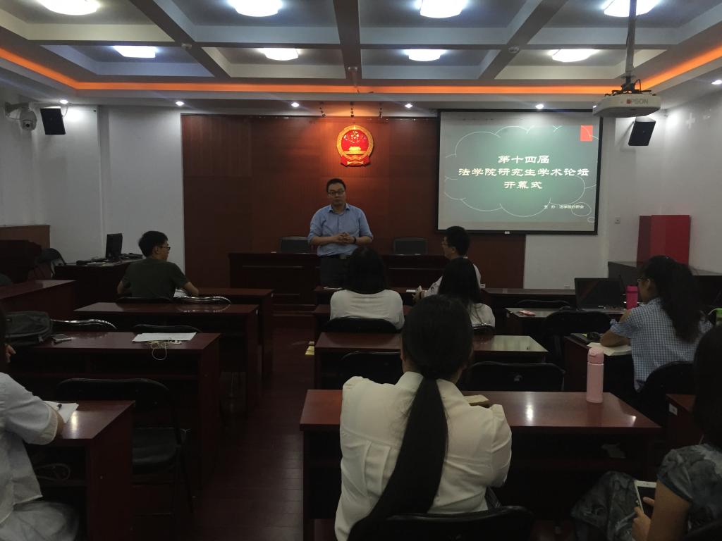 5月17日晚,第十四届法学院研究生学术论坛开幕式暨首场经验交流会在如心楼101顺利举办。法学院研究生指导主任李俊良老师,法学院副院长泮伟江老师,2014级刑法学博士研究生宁势强,2015级民商法硕士研究生麻瑞禛、薛媛元出席开幕式。会议由法学院研究生会学术中心副主席汪衍主持。
