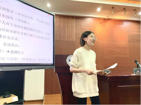 担任第二辩护人的谢妮轩学姐讲解十分全面,主要内容包括备赛流程、常见错误等。其中第二部分尤其生动形象,其从以往经验中提出了两个主要的关键词,分别为“渲染”与“内化”。其中,“渲染”指的是像讲故事一样输出己方的观点,无论是发表公诉意见书、辩护词,还是开展第二轮法庭辩论,都不能干涩地念稿,要提升论证与说服的技巧,在专业基础扎实、语言文字通畅的基础上,加一点说服的技巧,比如保持自信的微笑、与法官进行眼神交流等,增强法官(评委)的好感,说服合议庭。“内化”是指将他人的经验、帮助内化为自己的学识和能力。比如,吉老师提到的问题,需要立即加以改正,并且牢牢记住,不再重复跌倒。另外,还要发挥主观能动性,通过自己的摸索与探究,更深入地体会他人经验的深刻意涵,不能消极被动地跟着团队节奏走。