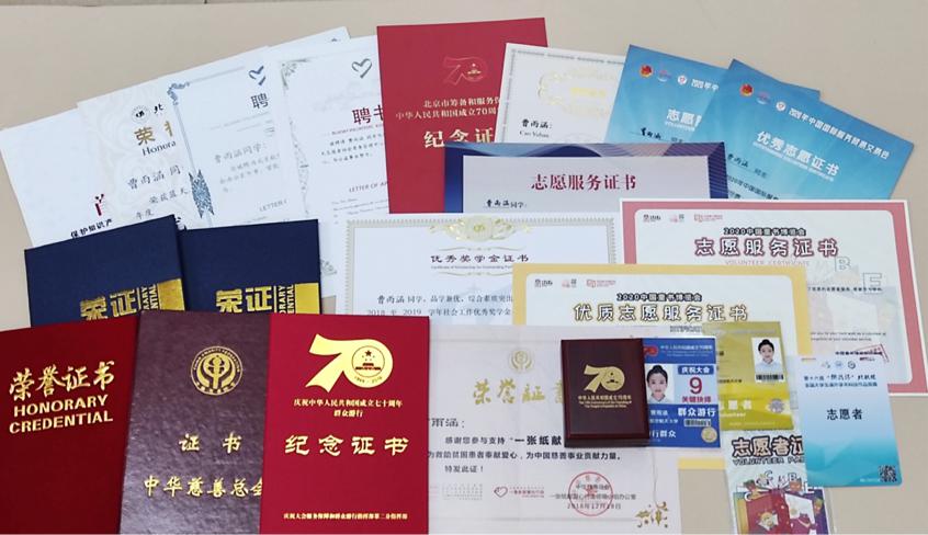 自大一入学起,曹雨涵即加入蓝天志愿者协会参与志愿工作,在一年多的志愿服务工作中,她积累了大量的经验,为多项校内外公共活动付出了青春的汗水。她曾参与“挑战杯”全国大学生课外学术科技竞赛、北航“强基计划”招生考试志愿服务,并在在疫情期间参与组织“手拉手”关怀抗议一线人员家属活动,组织志愿者为一线抗疫人员家中子女进行课业辅导;2020年9月参与中国国际服务贸易交易会志愿服务,担任组长及宣传骨干,协助负责人完成组织、联络及宣传工作,在工作中表现优异,获得“中国国际服务贸易交易会优秀志愿者”称号;在冬奥会志愿者报名通道开启后,曹雨涵第一时间响应报名,参与冬奥会骨干志愿者英语学习项目,积极准备服务北京冬奥。