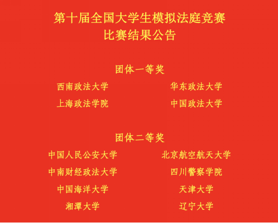 2023年11月12日晚,经两天四场的激烈角逐,由教育部法学国家级实验教学示范中心联席会主办的第十届全国大学生模拟法庭竞赛顺利落下帷幕。
