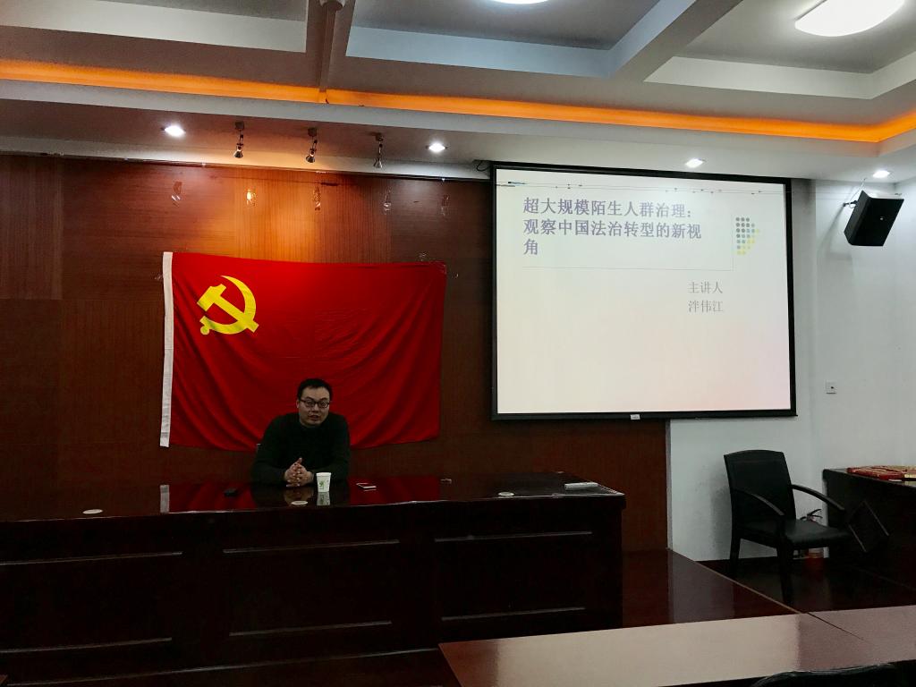 11月27日晚,英国上市公司365学生党校第二课如期而至,虽是周末,但学生党员的学习热情丝毫不减。党校第二课上,法学院党委委员、副院长泮伟江为全体党校学员做了题为“超大规模陌生人群治理,观察中国法治转型的新视角”的党课报告。
