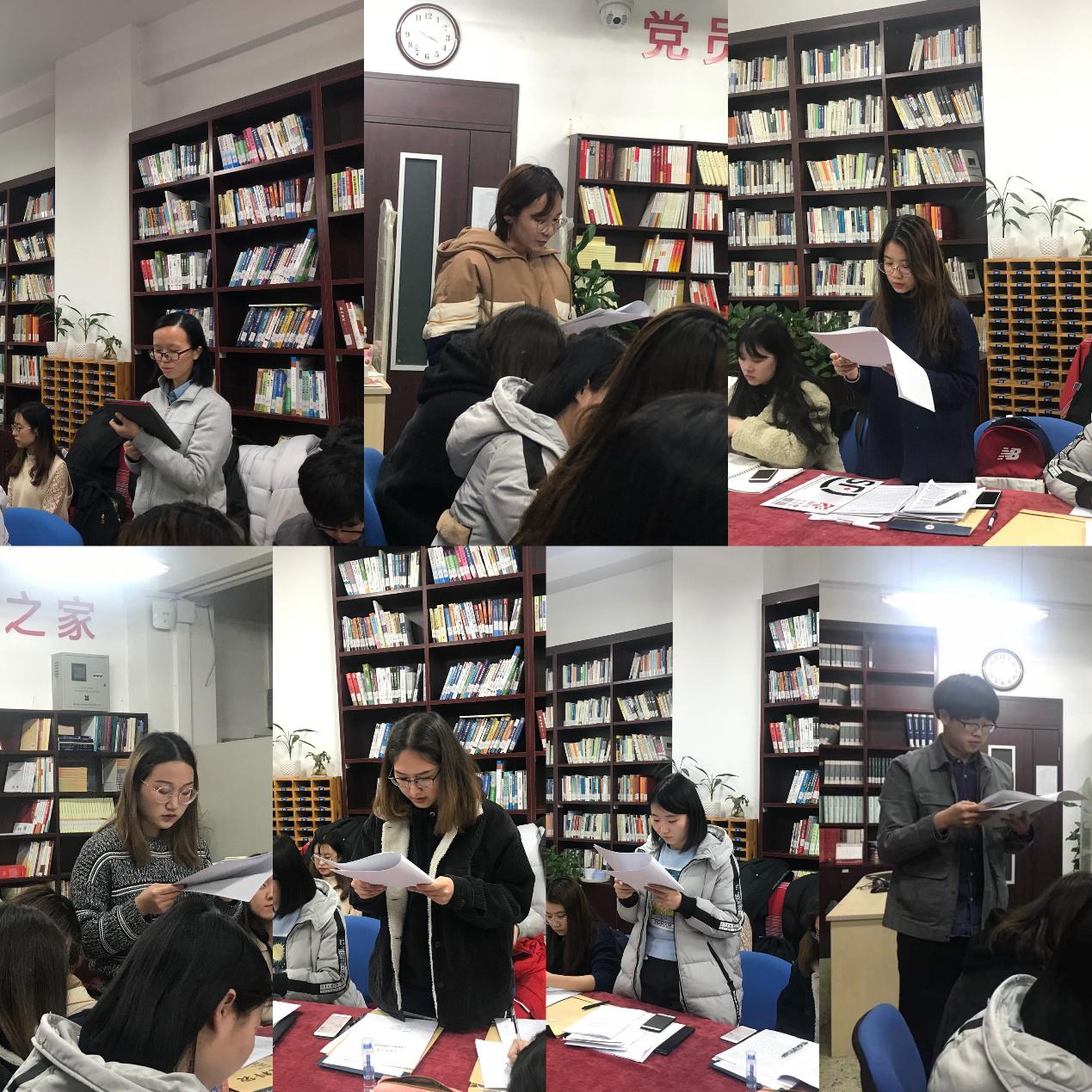 大会在高昂的国际歌歌声中开始,由支部书记董文展同志主持。魏哲哲、乐诗绮两位同志缺席。大会按照宣读志愿书、入党介绍人发表意见、党员讨论、投票表决、宣读大会决议和发展对象表态的顺序,逐一对发展对象进行考察和表决。王显菲等七位发展对象从对党的认识、入党动机、学习与社会工作情况、不足之处与改进措施等方面介绍了个人情况。各位发展对象对党认识较为深刻、入党动机端正,深入剖析自己的不足并提出改进措施,积极向党组织靠拢,表达出他们志愿加入中国共产党的强烈愿望和决心。经过表决,七位同志均以全票赞成通过,顺利被组织接纳为预备党员。发展对象也纷纷表态,表示在今后的工作和学习中,以党员的标准要求自己,发挥先锋模范作用,望各位同志监督。