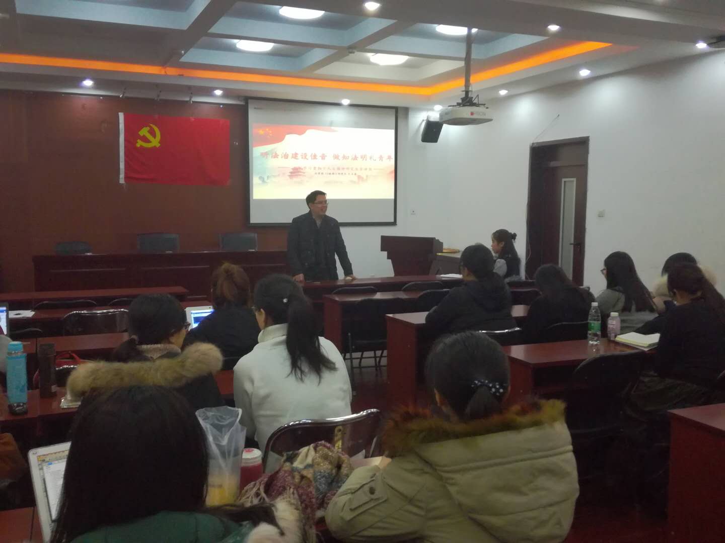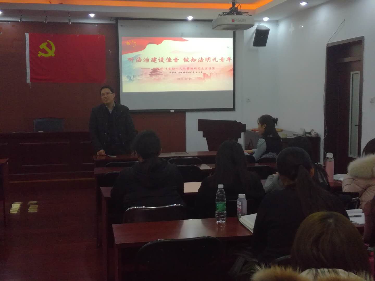 12月26日晚18点,法学院十九大精神宣讲系列党课第三讲在如心楼101室成功举办。此次党课的主题为“听法治建设佳音,做知法明礼青年”。法学院党委王琪全书记参加此次党课,并在课后与大家进行亲切的交谈,此外来自法学院研究生和本科各个年级及不同的支部共20余名同志参加了此次党课。